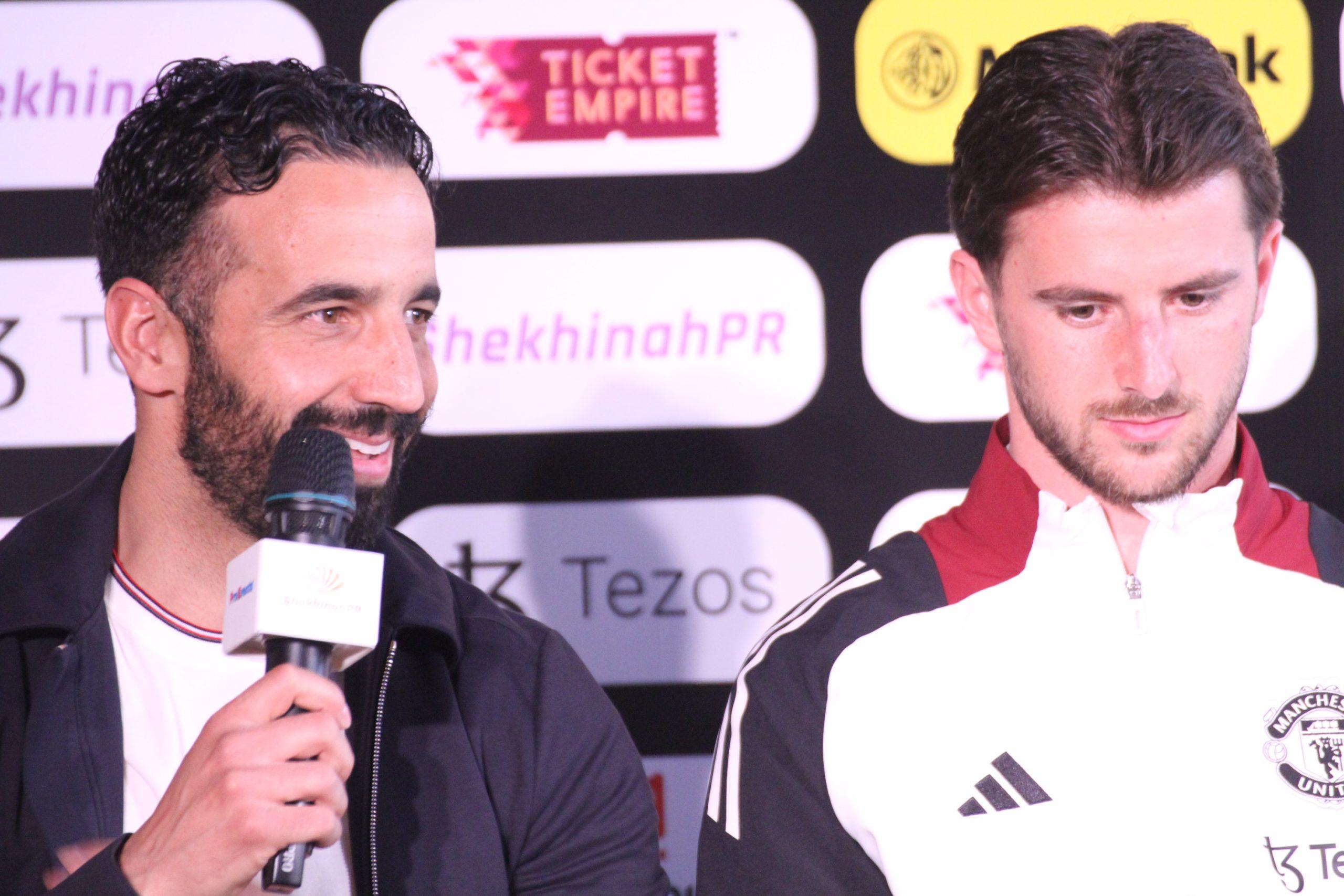 Pelatih Manchester United, Ruben Amorim dan Mason Mount saat di konferensi Pers Maybank Challange Cup. (Rinaldy Azka/Jebreeetmedia.com)